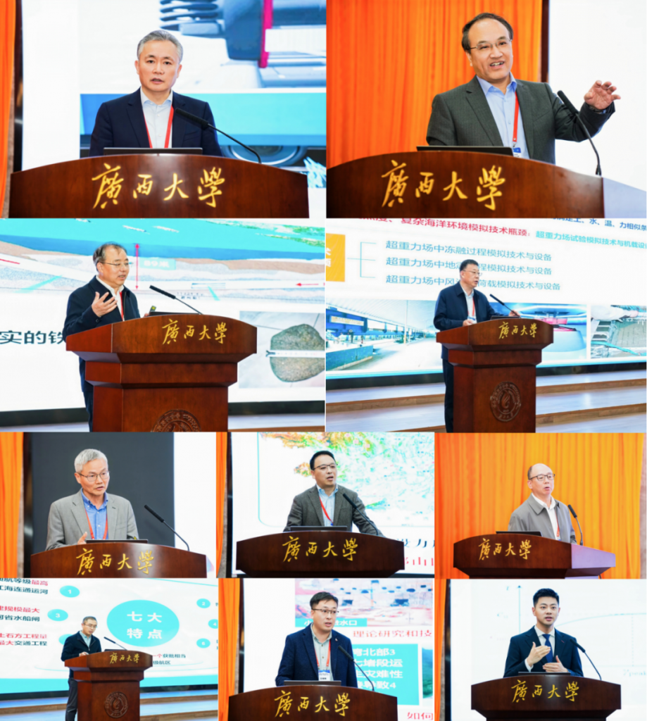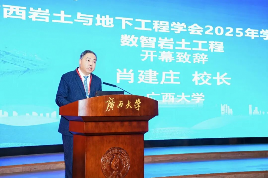 肖建庄校长代表学校致欢迎辞。他表示,广西正处西部陆海新通道建设前沿,平陆运河、南湛高铁、深部采矿等重大工程相继落地,复杂地质条件与数字化浪潮交汇,为岩土工程提出世界级命题。广西大学将充分发挥“双一流”土木工程学科优势,与各界携手打造政产学研用深度融合的高端平台,为国家战略和壮美广西建设贡献“数智”力量。