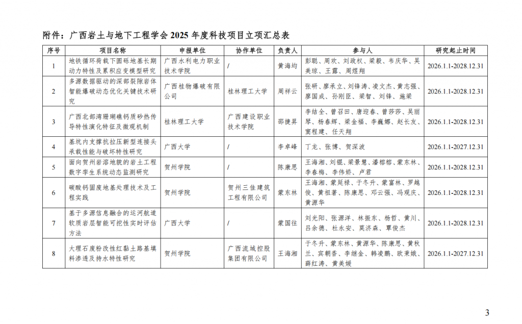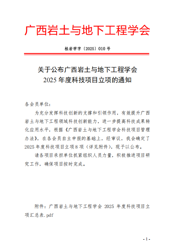 首页 > 学会动态 > 通知公告 > 关于公布广西岩土与地下工程学会 2025年度科技项目立项的通知—桂岩学字〔2025〕010号 关于公布广西岩土与地下工程学会 2025年度科技项目立项的通知—桂岩学字〔2025〕010号 2025年12月24日